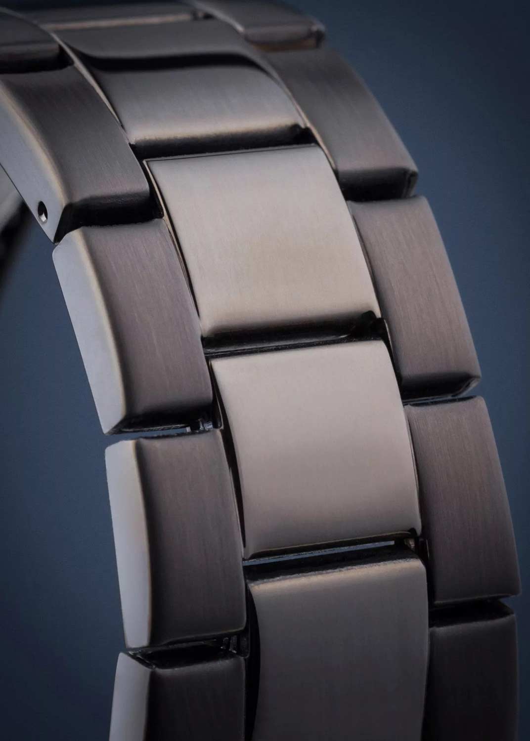 Окошко даты находится в положении между отметками 4 и 5 часов. Рифленая заводная головка. Браслет с раскладывающейся застежкой.