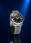 Окошко даты с увеличительным стеклом находится в положении 3 часа. Рифленая заводная головка. Браслет с раскладывающейся застежкой.