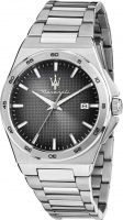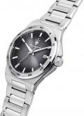 Метки в виде штрихов. Окошко даты находится в положении 3 часа. Рифленая заводная головка с защитой. Браслет с раскладывающейся застежкой.