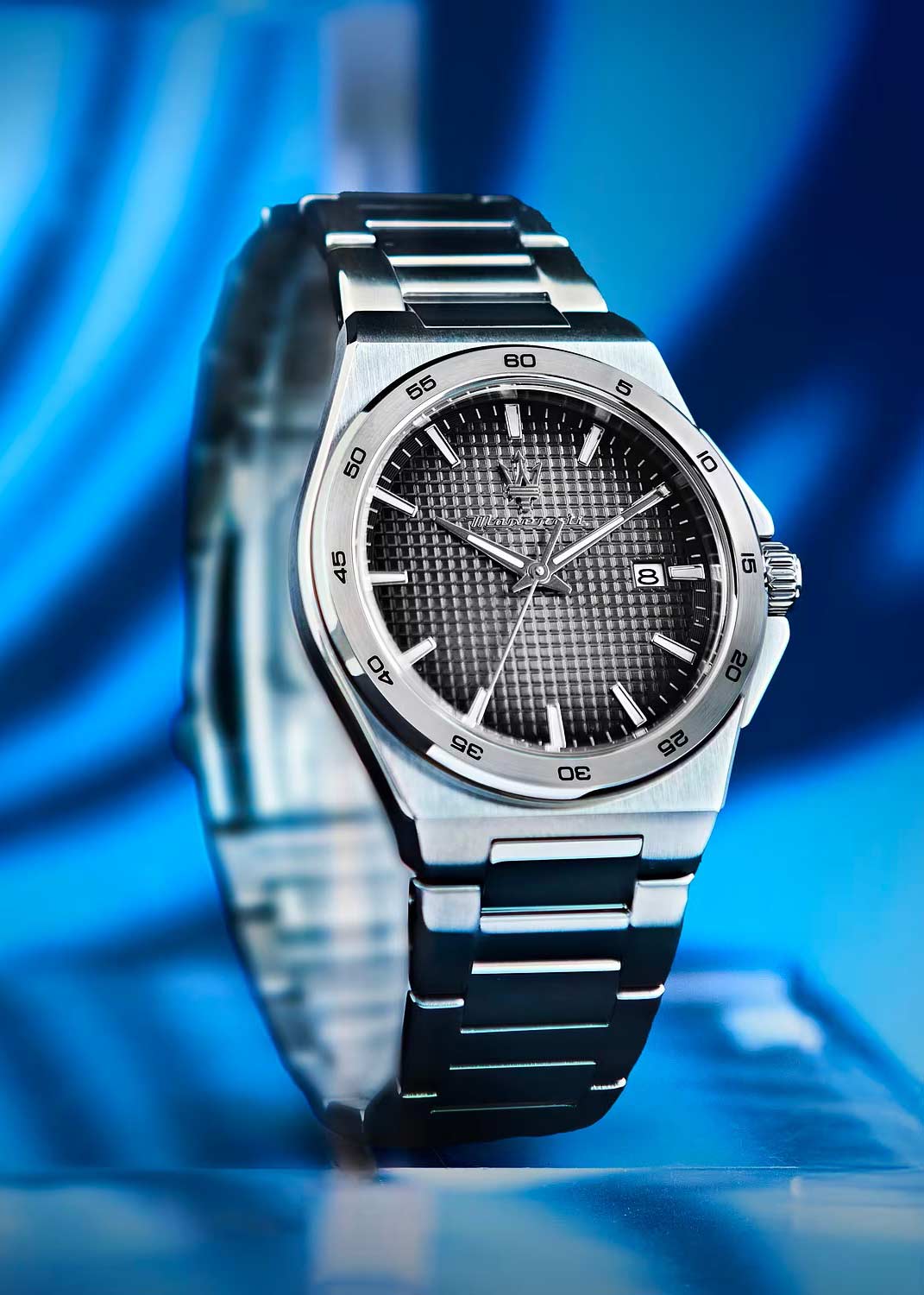 Метки в виде штрихов. Окошко даты находится в положении 3 часа. Рифленая заводная головка с защитой. Браслет с раскладывающейся застежкой.