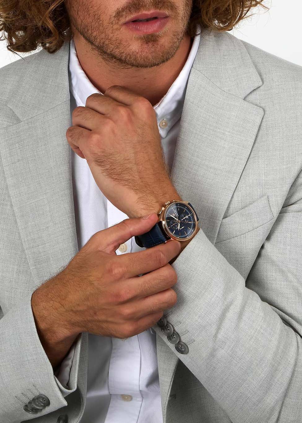 Метки в виде штрихов. Окошко даты находится в положении 6 часов. Рифленая заводная головка. Завинчивающаяся задняя крышка. Кожаный ремешок с классической застежкой.