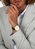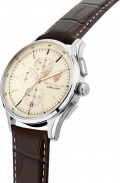 Окошко даты находится в положении 6 часов. Рифленая заводная головка. Завинчивающаяся задняя крышка. Кожаный ремешок с классической застежкой.
