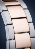 Окошко даты находится в положении 3 часа. Рифленая заводная головка с защитой. Завинчивающаяся задняя крышка. Браслет с раскладывающейся застежкой.