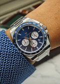 Окошко даты находится между часовыми метками 4 и 5. Рифленая заводная головка с защитой. Завинчивающаяся задняя крышка. Браслет с раскладывающейся застежкой.