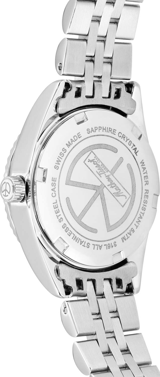 Прямоугольные стрелки в стиле Baton с люминесцентным покрытием SuperLumiNova, которое светится в темноте после непродолжительной зарядки на свету. Окошко даты с увеличительным стеклом находится в положении 3 часа. Стальной браслет с раскладывающейся застежкой.