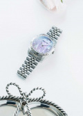 Прямоугольные стрелки с люминесцентным покрытием SuperLumiNova, которое светится в темноте после непродолжительной зарядки на свету. Окошко даты с увеличительным стеклом находится в положении 3 часа. Рифленый безель. Стальной браслет с раскладывающейся застежкой.