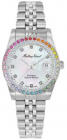 Кварцевые часы в круглом корпусе, украшенном разноцветными кристаллами Mathy Rainbow. Перламутровый циферблат с метками в виде кристаллов. Окошко даты с увеличительным стеклом. Рифленая заводная головка. Стальной браслет.
