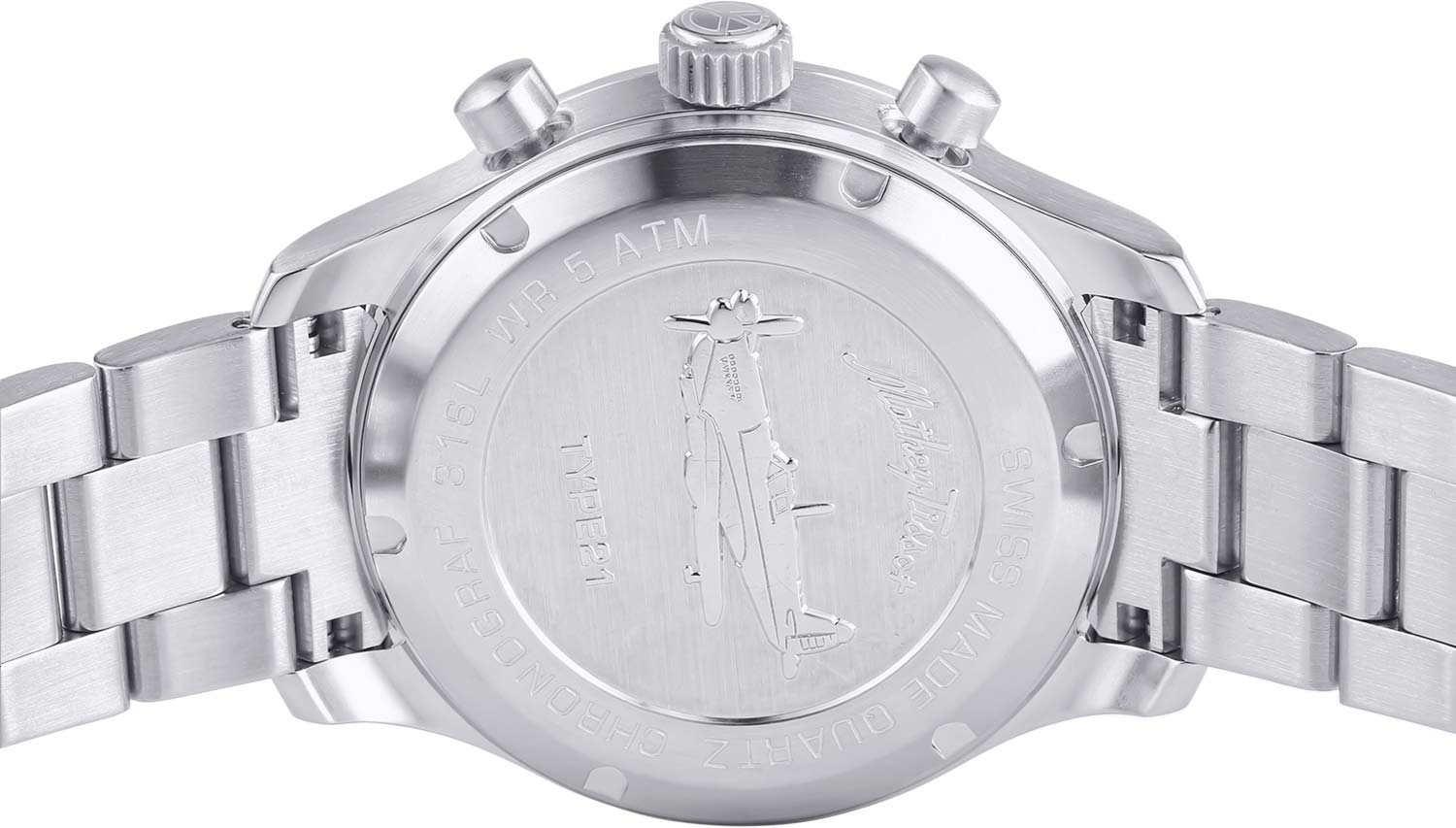 Часы выполнены в корпусе из нержавеющей стали диаметром 42 мм, с сатинированной отделкой и плавными обводами, характерными для хронографов авиационного назначения. Модель комплектуется кожаным ремешком с пряжкой из нержавеющей стали. Водозащита составляет 5 ATM, что соответствует повседневной эксплуатации, включая случайное попадание воды. Стекло — сапфировое, устойчивое к царапинам.