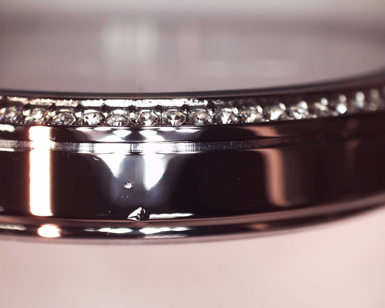 Женские наручные часы. Круглый стальной корпус. Безель инкрустирован кристаллами. Циферблат выполнен по технологии Sunray (солнечные лучи) и украшен логотипом бренда. Метки в виде штрихов. Клиновидные стрелки в стиле Dauphine. Рифленая заводная головка. Стальной браслет декорирован паве из кристаллов.