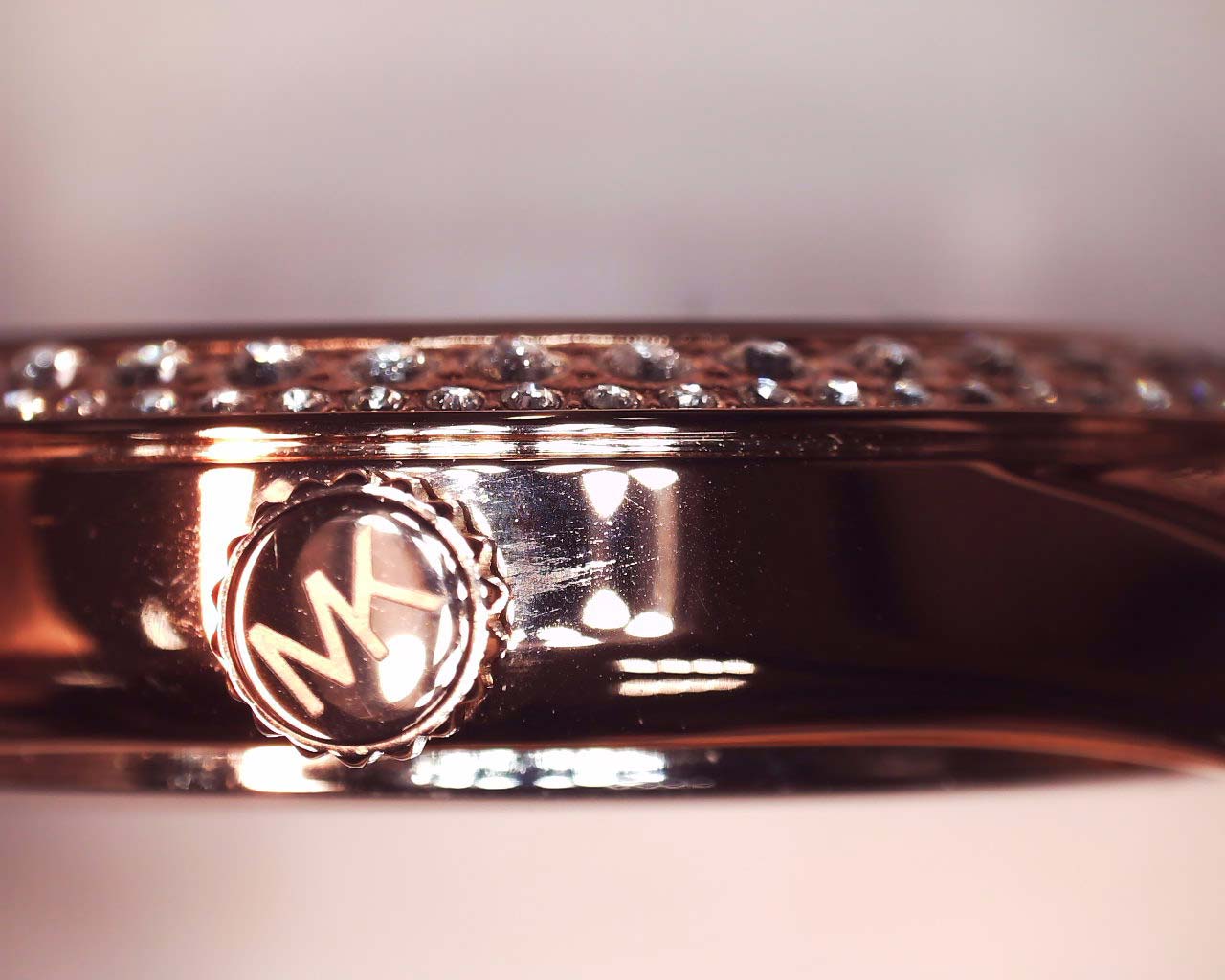 Женские кварцевые часы. Круглый стальной корпус с PVD покрытием цвета розового золота. Безель декорирован кристальным паве. Перламутровый по центру и декорированный узором в виде расходящихся лучей в зоне меток циферблат защищен минеральным стеклом. Метки в виде римских цифр и штрихов. Клиновидные стрелки в стиле Dauphine. Рифленая заводная головка. Стальной браслет с PVD покрытием цвета розового золота и раскладывающейся застежкой с двумя кнопками.