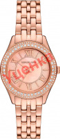 Женские кварцевые часы. Круглый стальной корпус с PVD покрытием цвета розового золота. Безель декорирован кристальным паве. Перламутровый по центру и декорированный узором в виде расходящихся лучей в зоне меток циферблат защищен минеральным стеклом. Метки в виде римских цифр и штрихов. Клиновидные стрелки в стиле Dauphine. Рифленая заводная головка. Стальной браслет с PVD покрытием цвета розового золота и раскладывающейся застежкой с двумя кнопками.