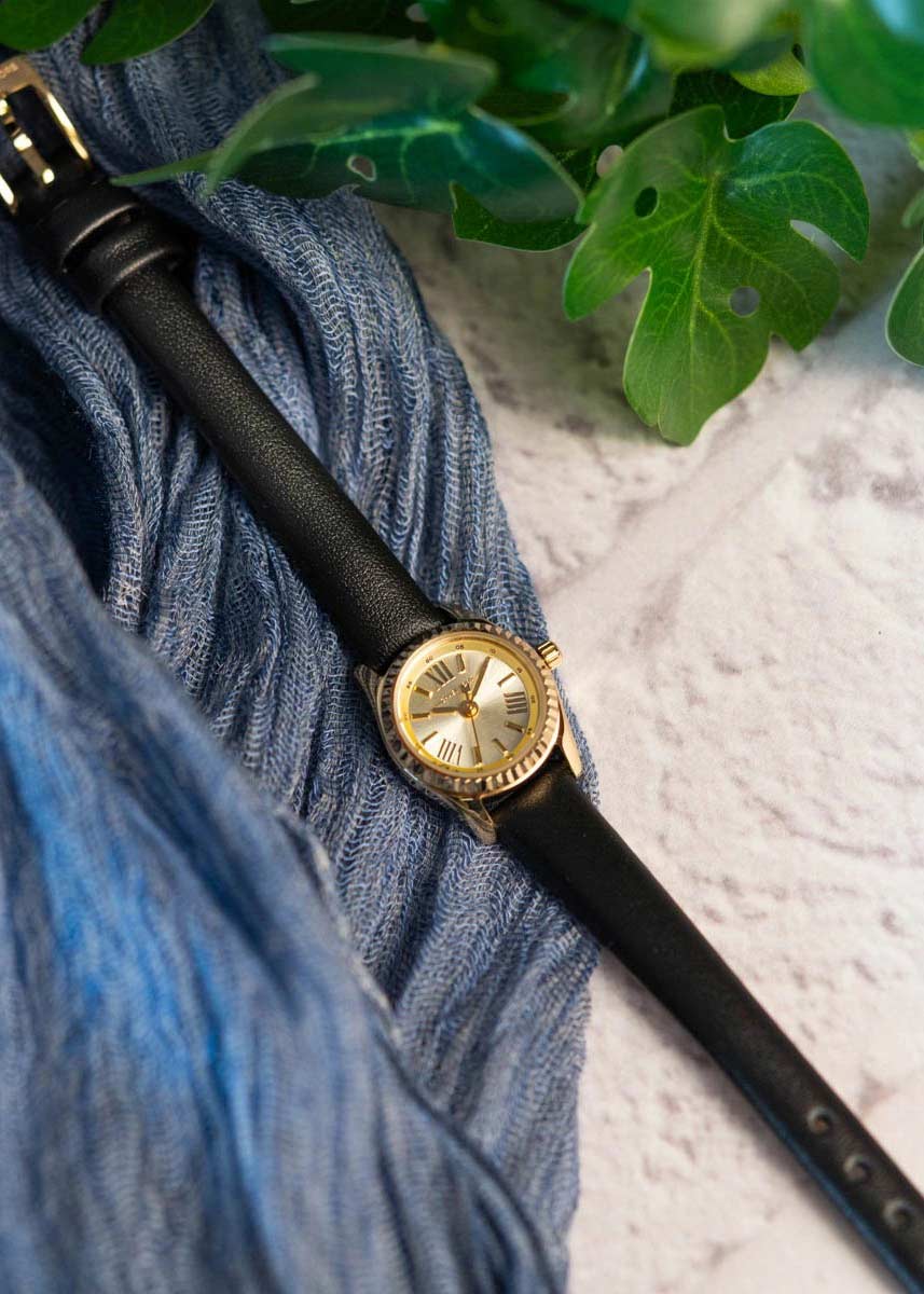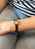 Метки в виде римских цифр и штрихов. Рифленая заводная головка. Кожаный ремешок с классической застежкой.