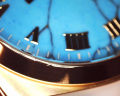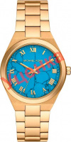 Женские кварцевые часы. Круглый стальной корпус с PVD покрытием цвета желтого золота. Бирюзовый циферблат с метками в виде римских цифр защищен минеральным стеклом. Рифленая заводная головка. Стальной браслет с PVD покрытием цвета желтого золота и раскладывающейся застежкой.