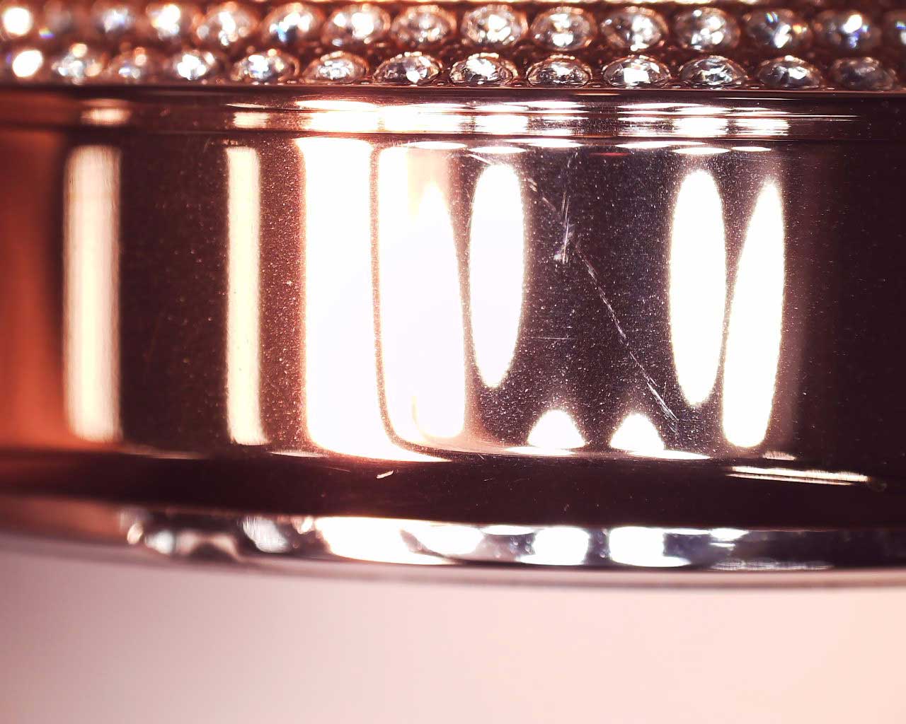 По краю циферблата нанесена минутная шкала. Окошко даты находится в положении между отметками 4 и 5 часов. Рифленая заводная головка с защитой. Завинчивающаяся задняя крышка. Стальной браслет с кристальным паве и раскладывающейся застежкой.