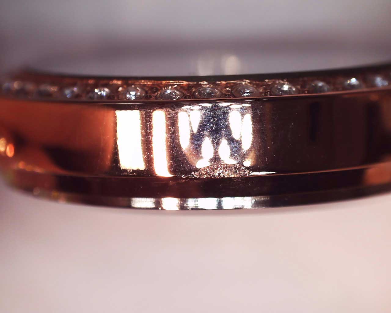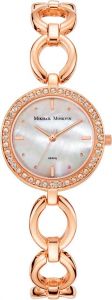 Женские наручные часы с японским кварцевым механизмом. Перламутровый циферблат с накладными метками в виде штрихов и точек. Безель украшен паве из кристаллов. Рифленая заводная головка.