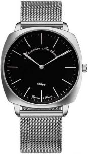 Мужские кварцевые часы с надежным японским механизмом. Циферблат с мечевидными стрелками и метками в виде штрихов. Рифленая заводная головка. Браслет миланского плетения.