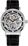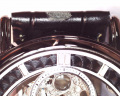 Мужские скелетонизированные механические часы с автоподзаводом. Запас хода 35 часов. Круглый латунный корпус. Циферблат защищен прочным сапфировым стеклом, устойчивым к образованию царапин. Метки в виде штрихов. Секундная стрелка вынесена на отдельный циферблат. На задней крышке имеется прозрачное окошко, через которое можно наблюдать работу механизма часов. Рифленая заводная головка. Кожаный ремешок с классической застежкой.