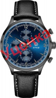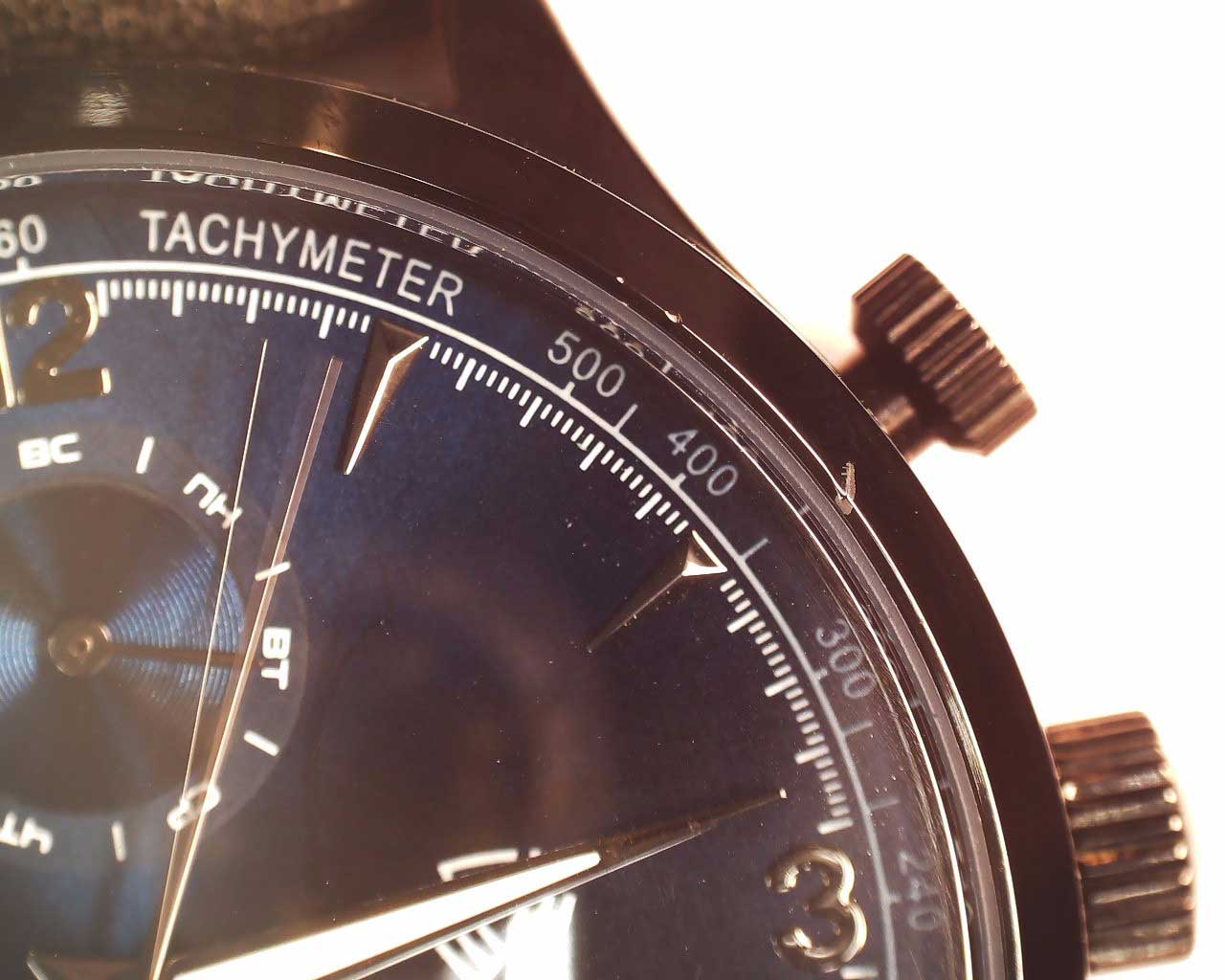 Часы с тахиметром. 12-ти и 24-х часовой формат времени. Время в 24-х часовом формате, дата и день недели вынесены на отдельные циферблаты. Циферблат выполнен по технологии Sunray (солнечные лучи). Метки в виде штрихов и арабских цифр. Ремешок с белой строчкой и классической застежкой.