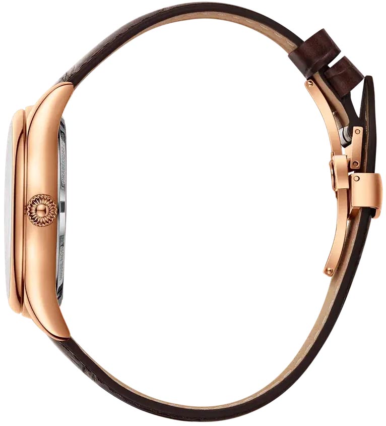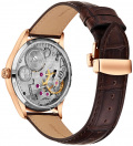 Циферблат с накладными метками в виде штрихов защищен прочным сапфировым стеклом. Рифленая заводная головка. Прозрачная задняя крышка. Ремешок с раскладывающейся застежкой.