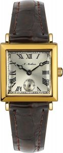 Секундная стрелка вынесена на отдельный циферблат. Рифленая заводная головка. Кожаный ремешок с классической застежкой.