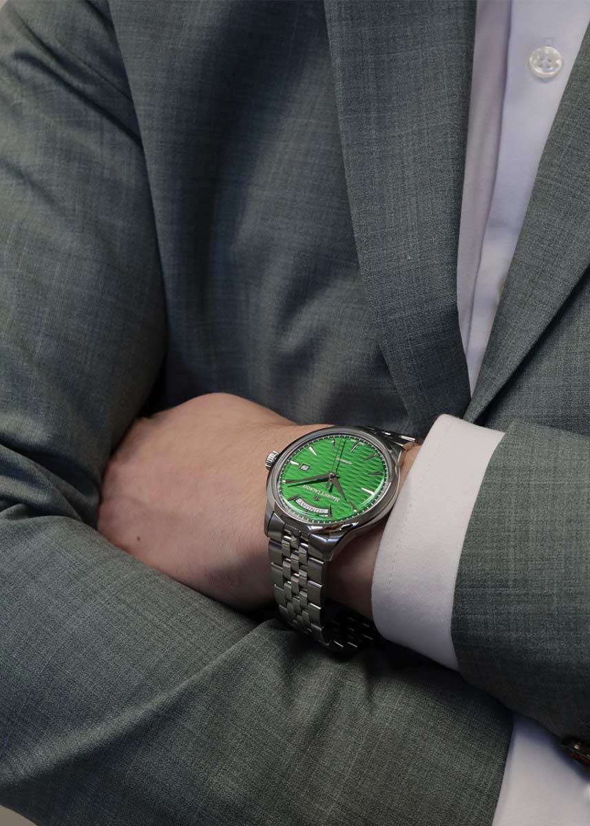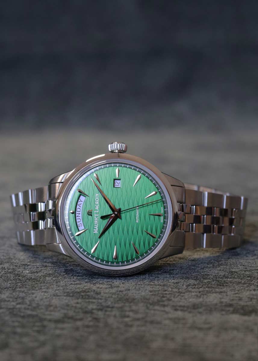 Клиновидные стрелки в стиле Dauphine. Окошко даты находится в положении 3 часа. Окошко дня недели расположено на отметке 12 часов. Заводная головка украшена камнем в форме кабошона и фирменным логотипом. Завинчивающаяся задняя крышка. Надежный стальной браслет с раскладывающейся застежкой. Система быстрой замены браслета. Бренд Maurice Lacroix заботится об окружающей среде и изготавливает фирменную упаковку из океанического переработанного пластика.