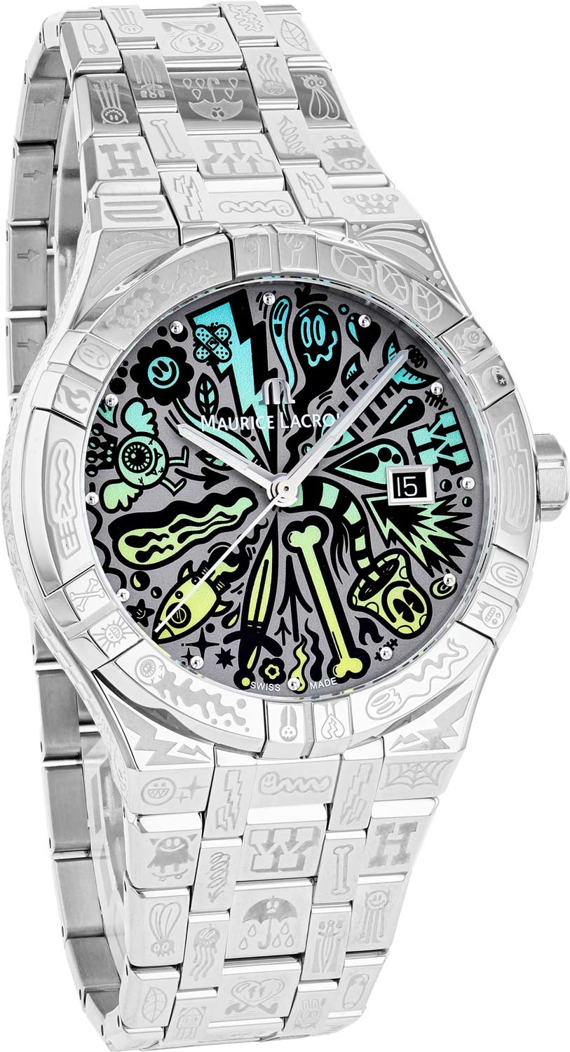 Стрелки с люминесцентным покрытием, которое светится в темноте после непродолжительной зарядки на свету. Окошко даты находится в положении 3 часа. Завинчивающаяся граненая заводная головка. Прозрачная задняя крышка крепится на винтах. Надежный стальной браслет с выгравированным узором Wotto и раскладывающейся застежкой. Система быстрой замены браслета. Бренд Maurice Lacroix заботится об окружающей среде и изготавливает фирменную упаковку из океанического переработанного пластика.