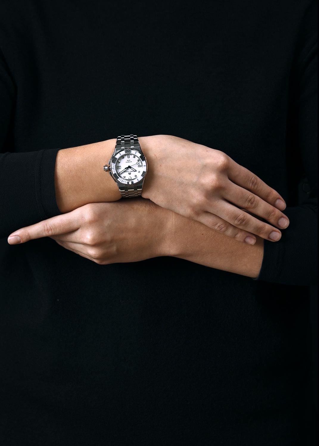 Окошко даты находится в положении 3 часа. Граненая завинчивающаяся заводная головка с защитой. Надежный стальной браслет с раскладывающейся застежкой. Система быстрой замены браслета. Бренд Maurice Lacroix заботится об окружающей среде и изготавливает фирменную упаковку из океанического переработанного пластика.