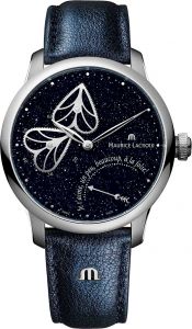 Ретроградный указатель дня недели в положении 5 часов. Прозрачная задняя крышка крепится на 4 винтах. Ремешок из натуральной кожи украшен логотипом компании и оснащен раскладывающейся застежкой. Бренд Maurice Lacroix заботится об окружающей среде и изготавливает фирменную упаковку из океанического переработанного пластика.