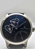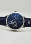 В левой части циферблата расположены два переплетенных скелетонизированных сердца. Это не просто декор, а сложная зубчатая передача, где сердца вращаются и постоянно соприкасаются, выполняя роль секундной стрелки.