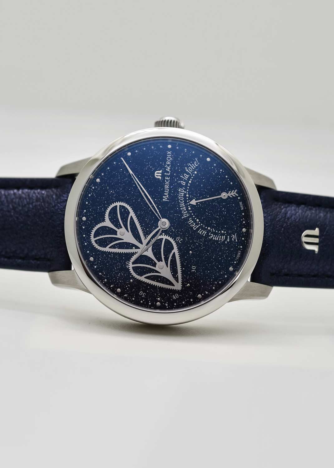 В левой части циферблата расположены два переплетенных скелетонизированных сердца. Это не просто декор, а сложная зубчатая передача, где сердца вращаются и постоянно соприкасаются, выполняя роль секундной стрелки.