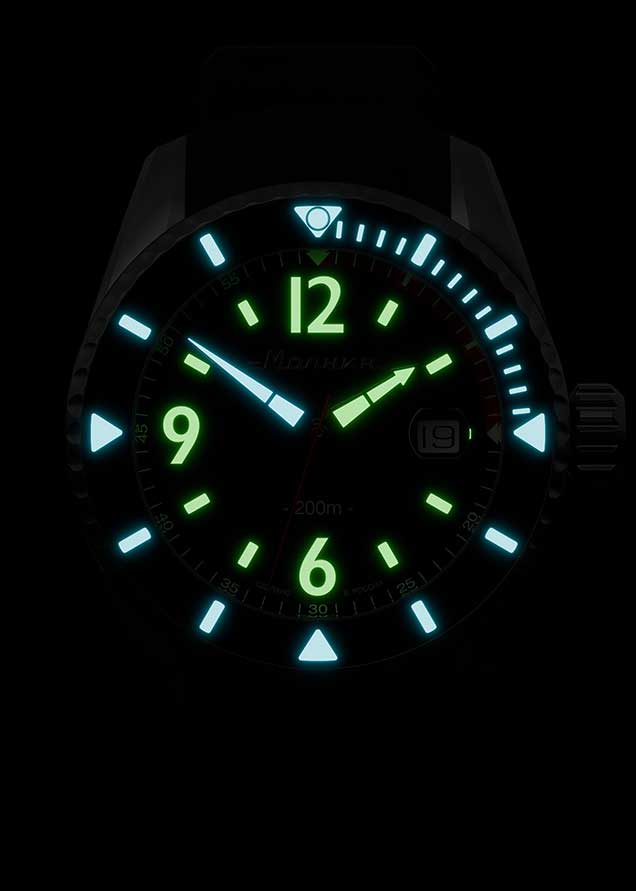 Циферблат с метками в виде штрихов и арабских цифр защищен прочным сапфировым стеклом толщиной 2,5мм. Метки и стрелки с люминесцентным покрытием SuperLuminova, которое светится в темноте после непродолжительной зарядки на свету.