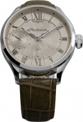 В мануфактурном механизме 18 камней, частота 18000 полуколебаний в час. Запас хода — 40 часов. Противоударное устройство балансового узла механизма. Секундная стрелка вынесена на отдельный циферблат, который находится в положении 9 часов.