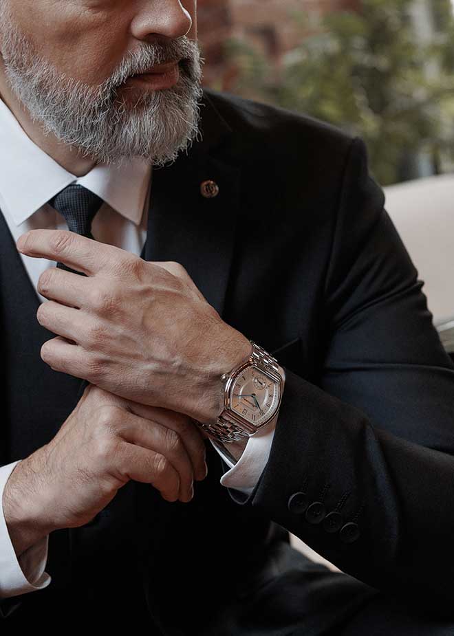 Циферблат с накладными метками в виде арабских цифр выполнен по технологии Sunray (солнечные лучи) и защищен прочным сапфировым стеклом толщиной 1,5мм.