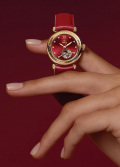 Круглый корпус из розового золота 585 пробы. Циферблат с метками в виде точек, украшенных кристаллами, и римской цифры XII. Сквозь прозрачное окошко на циферблате можно наблюдать за работой механизма часов.