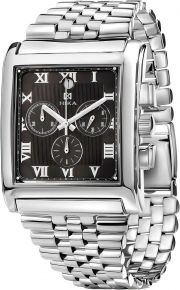 Мужские наручные часы-хронограф с секундомером. Квадратный корпус и браслет выполнены из серебра. Циферблат украшен узором из вертикальных линий. Прямоугольные стрелки в стиле Baton с люминесцентным покрытием, которое светится в темноте после непродолжительной зарядки на свету. Метки в виде римских цифр. Окошко даты находится в положении 12 часов. Рифленая заводная головка. Надежный серебряный браслет. Производитель оставляет за собой право вносить изменения во внешний вид часов.