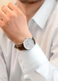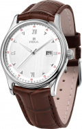 Накладные метки в виде римских цифр и объемных делений гармонично сочетаются с акцентными красными метками. Острые стрелки в стиле Alpha. Окошко даты находится в положении 3 часа. Рифленая заводная головка. Задняя крышка украшена гравировкой. Кожаный ремешок с классической застежкой.