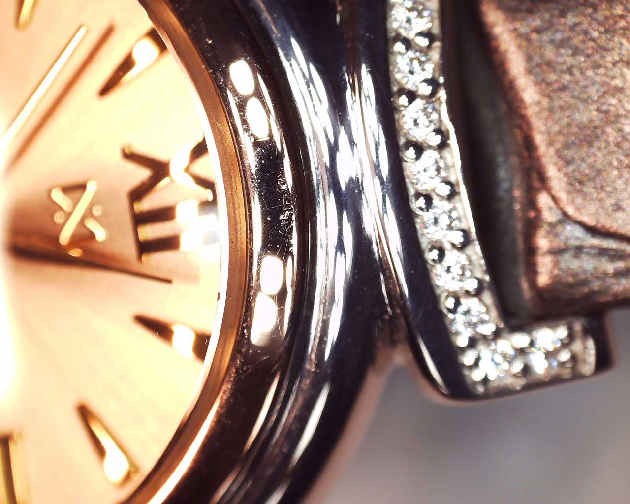 Bicolor. Женские кварцевые часы с корпусом украшенном фианитами. Циферблат выполнен по технологии Sunray (солнечные лучи). Метки в виде штрихов и римских цифр. Безель выполнен из розового золота 585 пробы. Заводная головка и пряжка ремешка выполнены из нержавеющей стали в цвет корпуса. Ремешок с классической застежкой. Производитель оставляет за собой право вносить изменения во внешний вид часов.