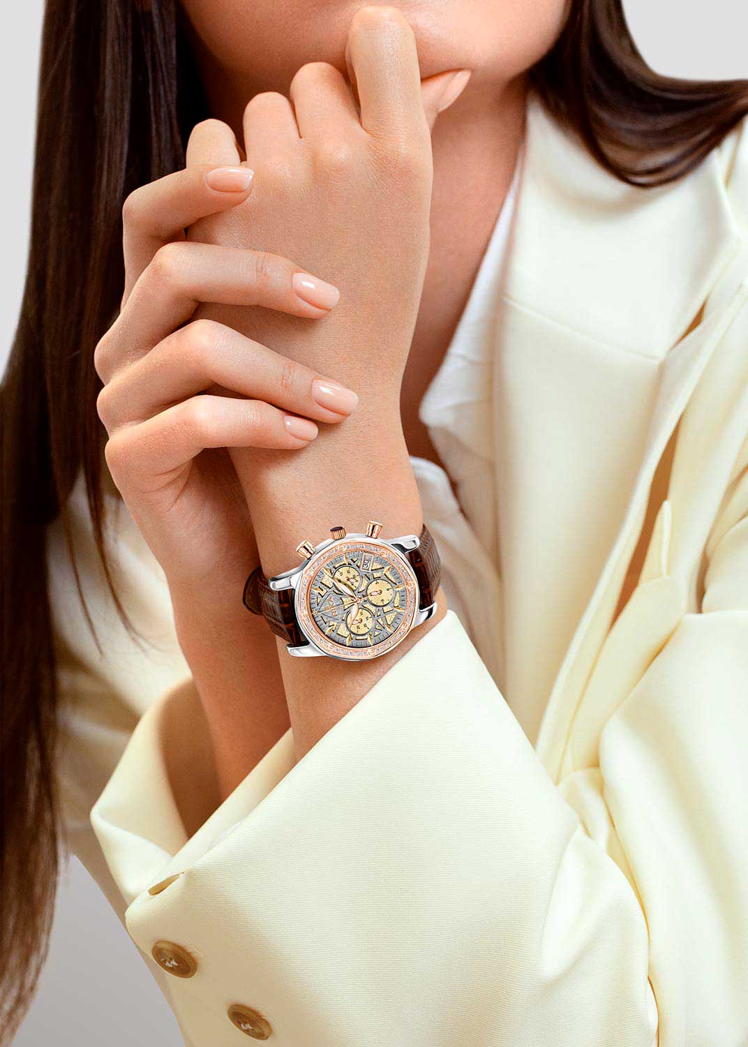 Фактурный двухуровневый циферблат украшен логотипом бренда. Накладные метки в виде штрихов. Листовидные стрелки в стиле Feuille с люминесцентным покрытием, которое светится в темноте после непродолжительной зарядки на свету.