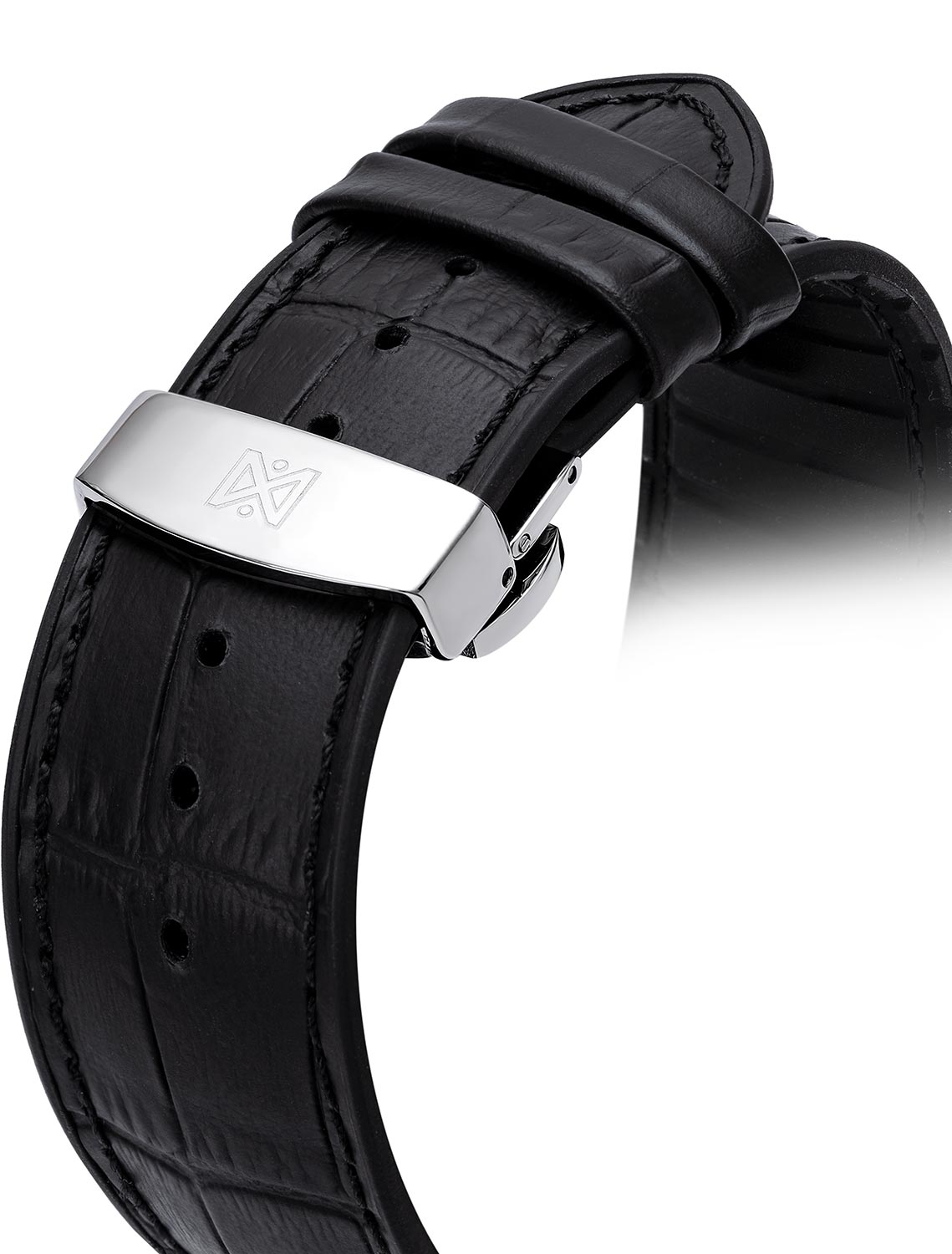 Сквозь циферблат можно разглядеть работу надежного японского механизма. Метки в виде штрихов. Заостренные прямоугольные стрелки в стиле Baton с люминесцентным покрытием, которое светится в темноте после непродолжительной зарядки на свету. Рифленая заводная головка. Удобный ремешок из натуральной кожи с раскладывающейся застежкой.