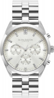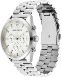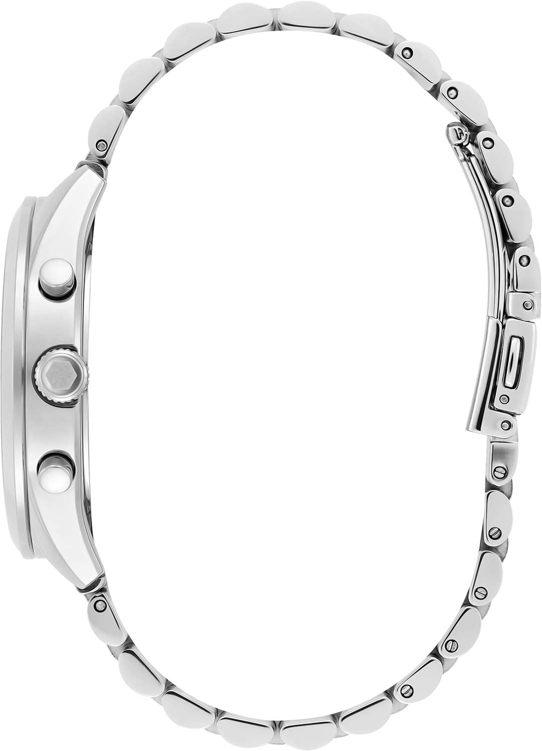 Метки в виде штрихов с кристаллами. Время в 24-х часовом формате и день недели вынесены на отдельные циферблаты. Рифленая заводная головка. Браслет с раскладывающейся застежкой.