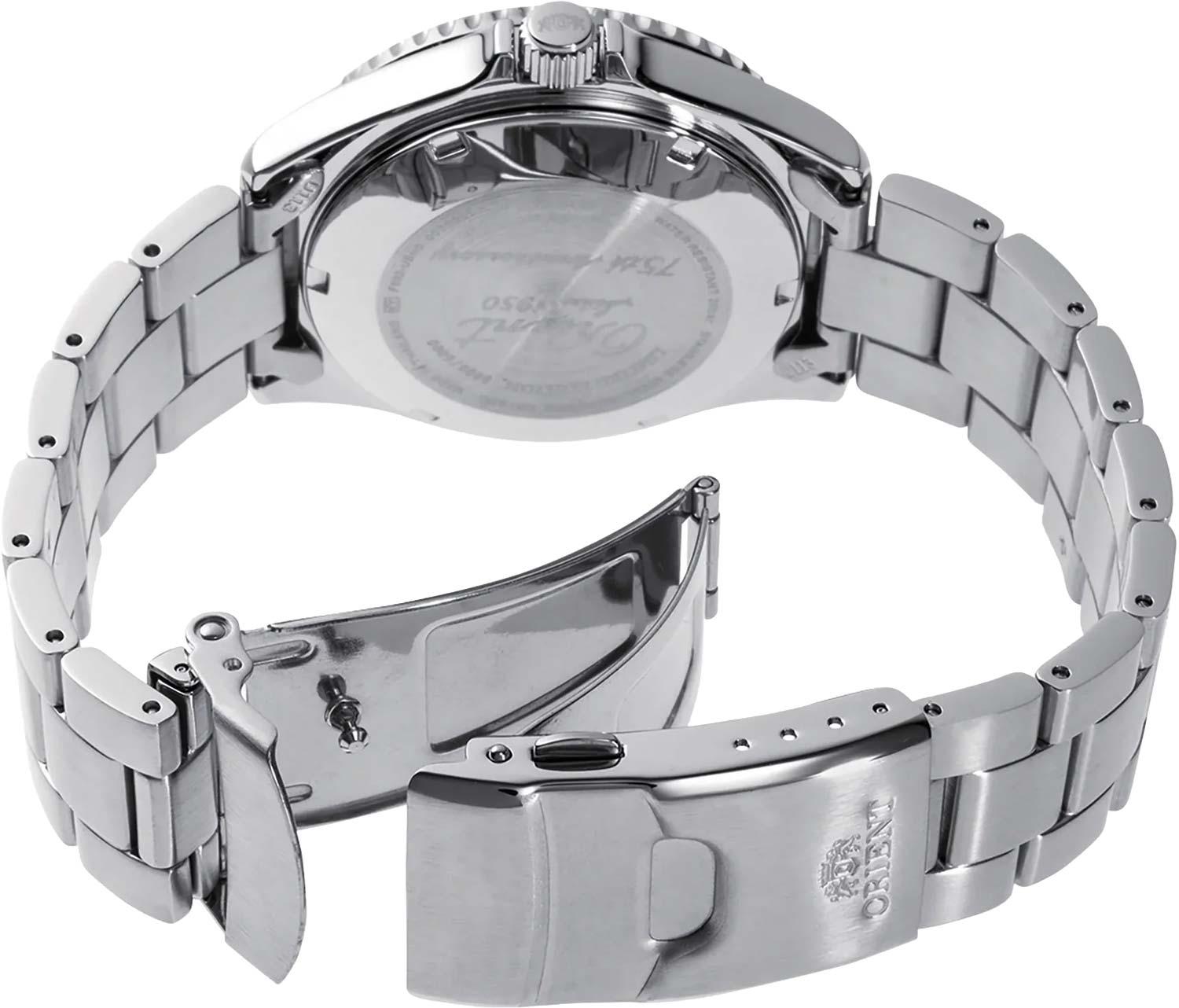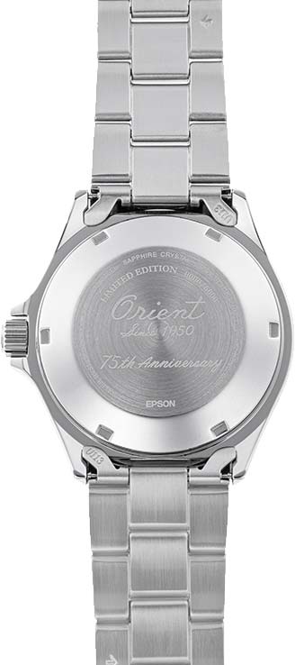 Метки в виде штрихов. Двойное окошко даты и дня недели находится в положении 3 часа. Завинчивающиеся заводная головка с защитой. Завинчивающаяся задняя крышка с надписью ''Orient Since 1950 — 75th Anniversary''. Надежный стальной браслет с раскладывающейся застежкой. Застежка с системой блокировки.