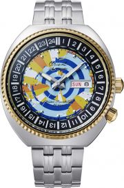 времени отображается на внутреннем вращающимся безеле, который управляется заводной головкой расположенной в положении 4 часа. Циферблат с метками в виде точек украшен изображением карты мира. Окошко даты и дня недели находится в положении 3 часа. Завинчивающаяся заводная головка. Браслет с раскладывающейся застежкой.