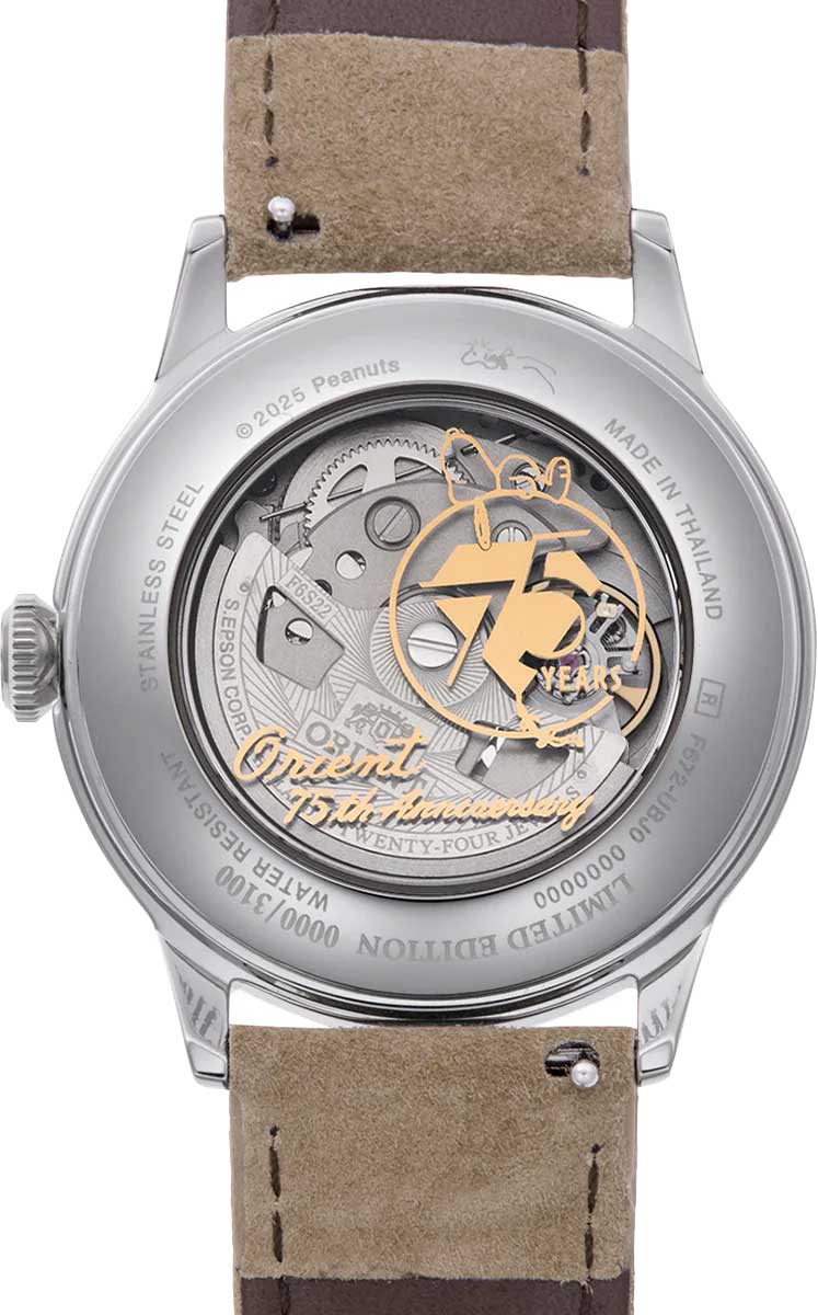 Циферблат с метками в виде штрихов украшен изображением персонажей Снупи (Snoopy) и Вудстока (Woodstock). Окошко даты находится в положении 3 часа. Прозрачная задняя крышка. Ремешок с классической застежкой и системой быстрой замены.