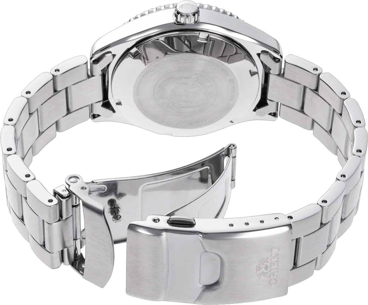 вращается на 120 щелчков в одном направлении. Окошко даты находится в положении 3 часа. Завинчивающиеся заводная головка и задняя крышка. Браслет с раскладывающейся застежкой. Застежка с системой блокировки.