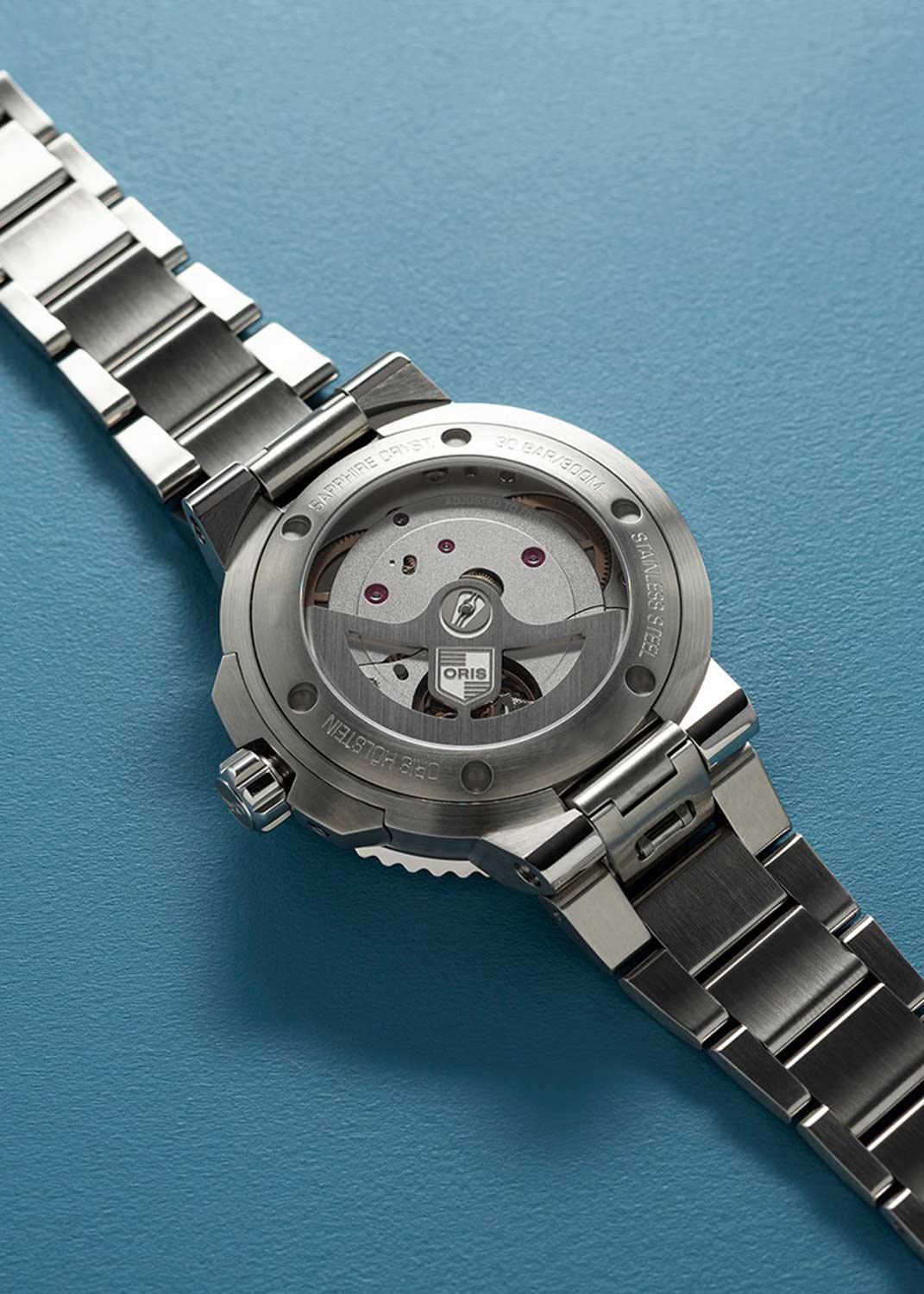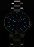 Завинчивающаяся рифленая заводная головка с защитой. Завинчивающаяся прозрачная задняя крышка с сапфировым стеклом. Многокомпонентный браслет с раскладывающейся застежкой. Застежка с системой блокировки и увеличением длины.