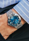 Круглый стальной корпус. Рифленый керамический безель с минутной шкалой. Циферблат выполнен по технологии Sunray (солнечные лучи). Метки в виде штрихов. Окошко даты находится в положении 6 часов. Люминесцентное покрытие стрелок и меток позволит вам следить за временем даже в полной темноте.