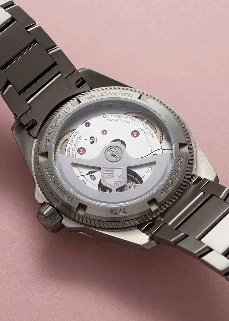 Завинчивающаяся прозрачная задняя крышка с сапфировым стеклом. Завинчивающаяся рифленая заводная головка с защитой. Титановый браслет с раскладывающейся застежкой.