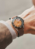Круглый стальной корпус. Рифленый бронзовый безель с минутной шкалой. Градиентный циферблат с метками в виде точек и штрихов. Окошко даты находится в положении 6 часов. Люминесцентное покрытие стрелок позволит вам следить за временем даже в полной темноте.