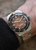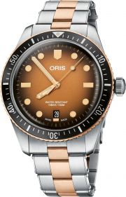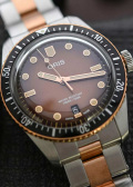 Круглый стальной корпус. Рифленый бронзовый безель с минутной шкалой. Градиентный циферблат с метками в виде точек и штрихов. Окошко даты находится в положении 6 часов. Люминесцентное покрытие стрелок позволит вам следить за временем даже в полной темноте.