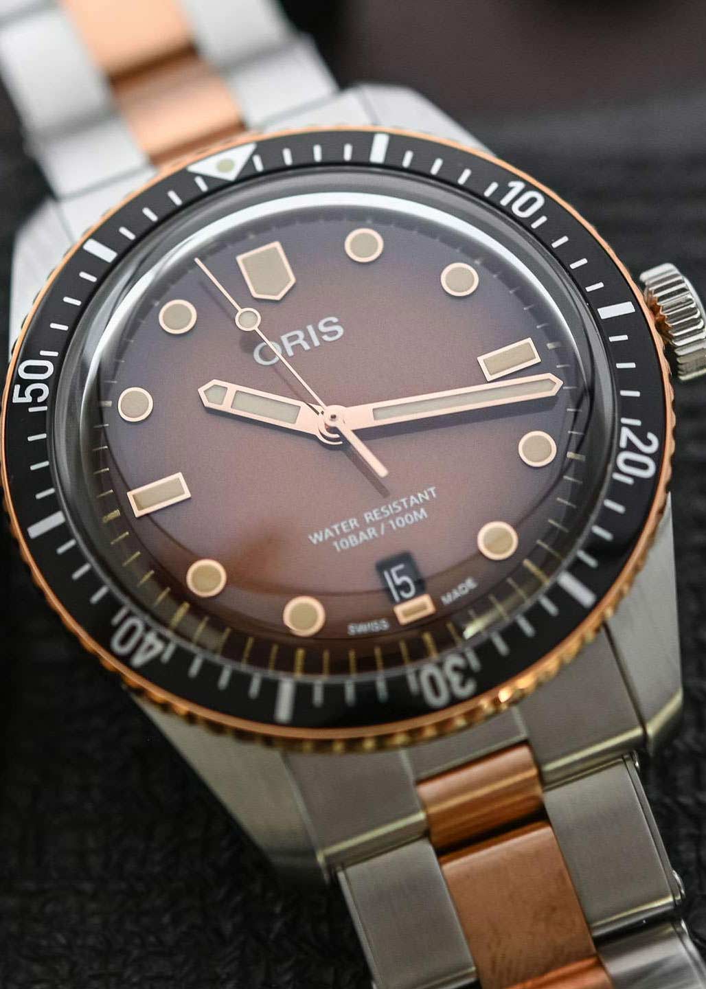 Круглый стальной корпус. Рифленый бронзовый безель с минутной шкалой. Градиентный циферблат с метками в виде точек и штрихов. Окошко даты находится в положении 6 часов. Люминесцентное покрытие стрелок позволит вам следить за временем даже в полной темноте.